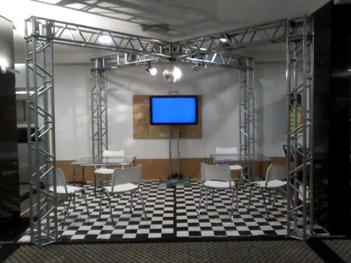 Aluguel de estrutura metálica treliçada em alumínio, geralmente em 15 x 15 cm, para fixar telas de projetores, banners. Também disponível em Box Truss 30 x 30 cm para palcos, coberturas, pistas de danças e afins.